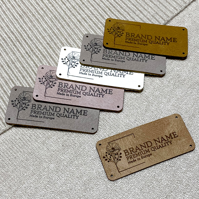 Synthetic leather labels customized to order by laser engraving with the manufacturer's name or logo Model EP-M101, for various clothing items handmade or created in the tailoring workshop. This model of faux leather label is made of polyurethane, also known as synthetic leather, with high quality, using high-performance techniques and equipment. The labels are laser cut according to the dimensions presented on this page and the customization is done by laser engraving with a precision of up to 0.2mm.