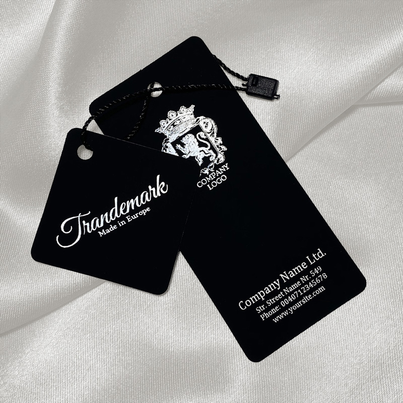 Set consisting of 2 gorgeous cardboard labels including seal with string for clothes, made of black Soft Touch laminated cardboard and personalized with silver folio Digital Hot Stamp type. This type of hang tag is made of high quality materials, using the most advanced technologies in the field of Digital print and finishing.