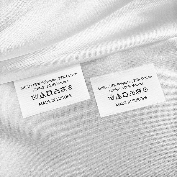 Textile label with washing and care symbols, and information about the material composition, customized on a fine high quality satin, ultrasonically hot cut. This type of textile label is made using the most advanced technologies in the digital printing field on a textile support. The labels are printed on a special satin by thermal transfer method, with an impressive print quality and high wash resistance.