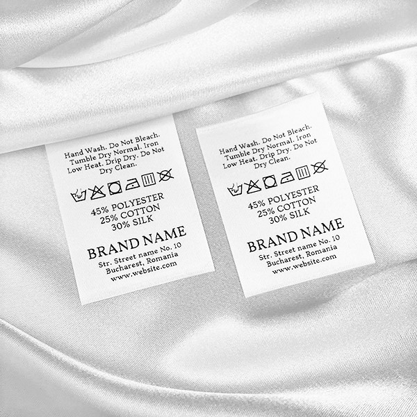 Laundry care label made of fine white satin, customized with manufacturer's name and logo, washing symbols and the type of material used to produce the item to which will be sewn. This type of textile label is made using the most advanced technologies in the digital printing field on a textile support. The labels are printed on a special satin by thermal transfer method, with an impressive print quality and high wash resistance.