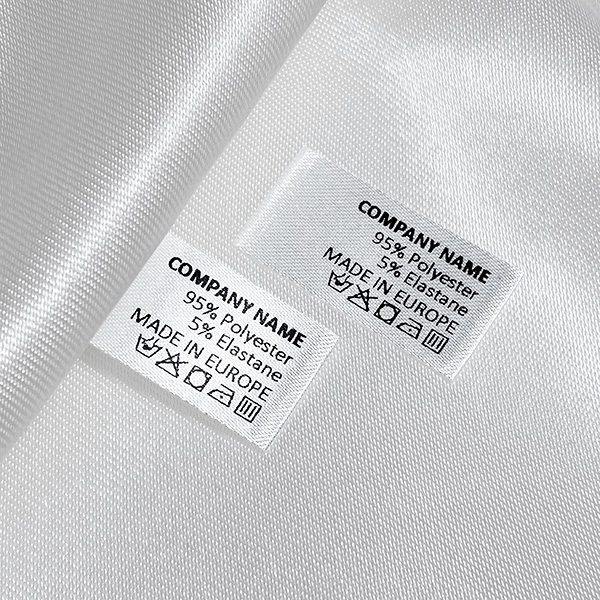 Laundry care custom label with small dimensions for sewing on various clothing items, made to order from satin. This type of textile label is made using the most advanced technologies in the digital printing field on a textile support. The labels are printed on a special satin by thermal transfer method, with an impressive print quality and high wash resistance.