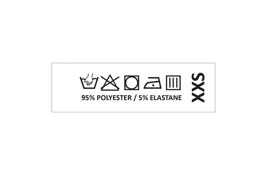 Laundry care label with symbols of washing and material’s composition, with the indication of the clothing item size, made to order from satin textile material with black print. This type of textile label is made using the most advanced technologies in the digital printing field on a textile support. The labels are printed on a special satin by thermal transfer method, with an impressive print quality and high wash resistance.