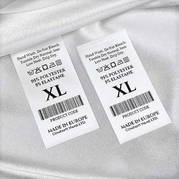 Textile label customized with barcodes, washing and size symbols, maintenance instructions and manufacturer's name made of fine white satin. This type of textile label is made using the most advanced technologies in the digital printing field on a textile support. The labels are printed on a special satin by thermal transfer method, with an impressive print quality and high wash resistance.