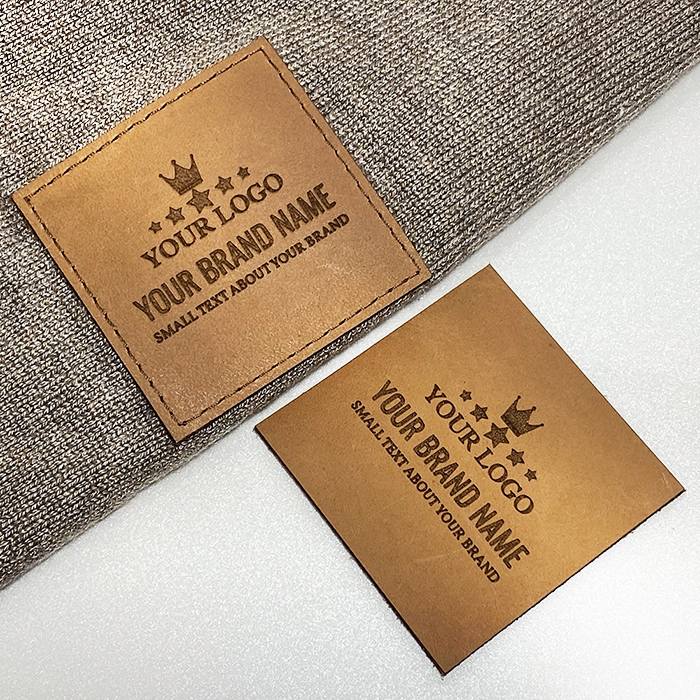 Label made of natural leather with premium finishes Model EP-M20, personalized with the name or logo of the brand, suitable for various clothing items and accessories such as scarves, gloves, caps, hats, etc. This leather label model is made of high-quality genuine leather, using the latest generation equipment and professional laser engraving or embossing methods.