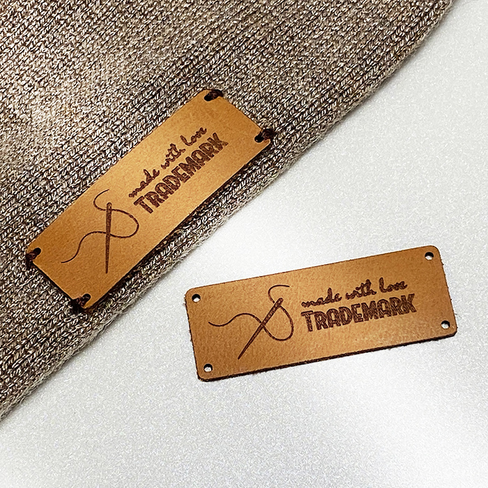 Custom natural leather label for clothes Model EP-M63, with the manufacturer's name or logo by laser engraving. This leather label model is made of high-quality genuine leather, using the latest generation equipment and professional laser engraving or embossing methods.
