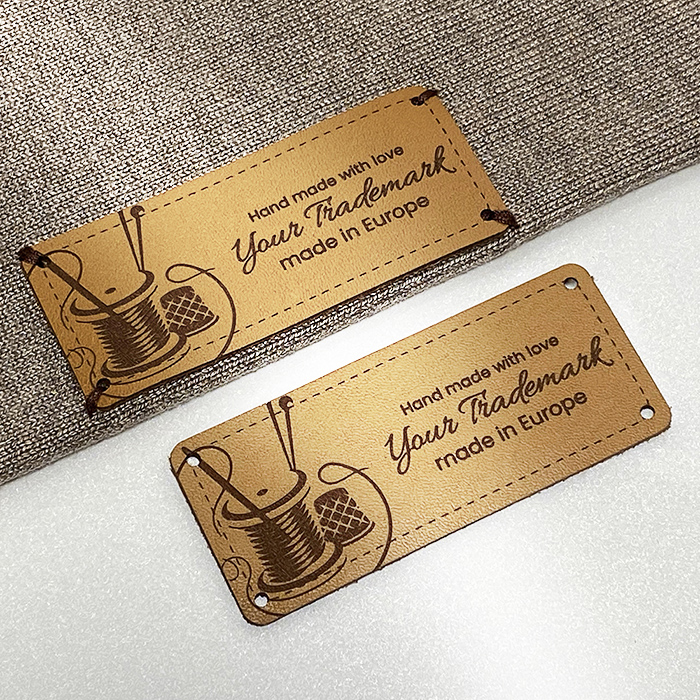 Custom natural leather label for clothes Model EP-M64, with the manufacturer's name or logo by laser engraving. This leather label model is made of high-quality genuine leather, using the latest generation equipment and professional laser engraving or embossing methods.