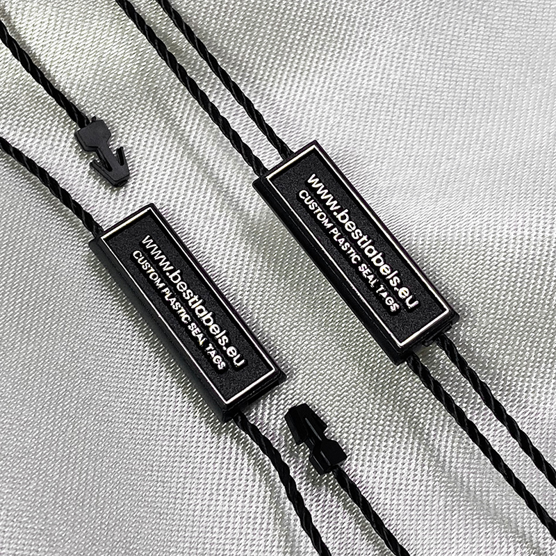 Custom plastic seal tag ST-M146 for fashion products, such as clothes, footwear, bags, jewelry, clothing accessories, etc.