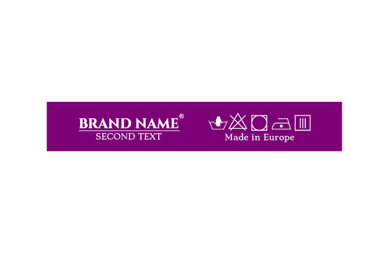 Laundry care label customized with washing symbols, and the Brand name or logo, model TL-72 suitable for any textile product, especially clothing items. This type of textile label is made using the most advanced technologies in the digital printing field on a textile support. The labels are printed on a special satin by thermal transfer method, with an impressive print quality and high wash resistance.