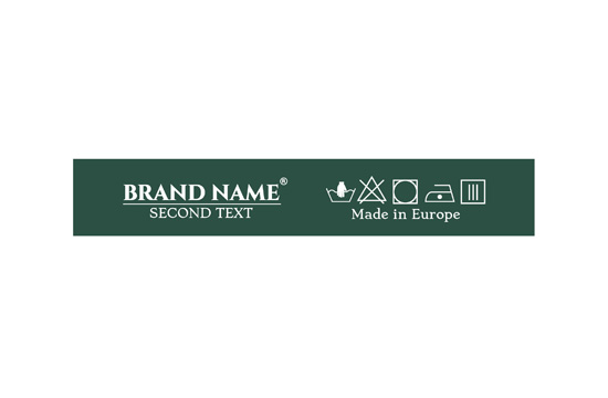 Laundry care label customized with washing symbols, and the Brand name or logo, model TL-91 suitable for any textile product, especially clothing items. This type of textile label is made using the most advanced technologies in the digital printing field on a textile support. The labels are printed on a special satin by thermal transfer method, with an impressive print quality and high wash resistance.