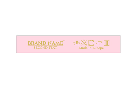 Laundry care label customized with washing symbols, and the Brand name or logo, model TL-96 suitable for any textile product, especially clothing items. This type of textile label is made using the most advanced technologies in the digital printing field on a textile support. The labels are printed on a special satin by thermal transfer method, with an impressive print quality and high wash resistance.