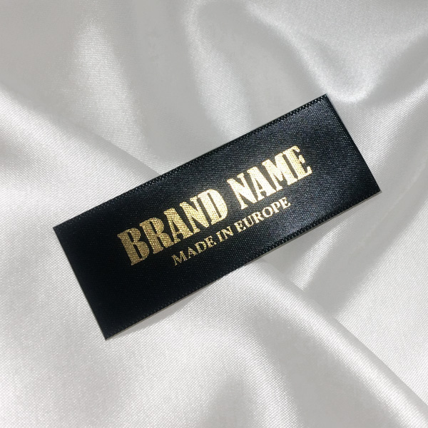 Fabric label printed with the Brand name with golden writing on a fine black color satin, suitable for clothes. This type of textile label is made using the most advanced technologies in the digital printing field on a textile support. The labels are printed on a special satin by thermal transfer method, with an impressive print quality and high wash resistance.