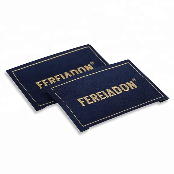 Woven label customized with Digital High Density embroidered inscriptions, with rectangular shape and folded edges.